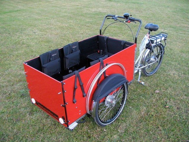 Mit 23 kg ultraleichtes Lastenrad aus unverwüstlichem Carbon, in der Mitte teilbar, mit Tretantrieb, Kindersitzen, Gurten und Verdeck.